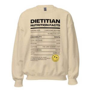 If there’s one true stereotypical thing every dietitian knows, it’s how to dissect a food label. This sweatshirt breaks down the qualities of a dietitian in a fun food label format and comes in four great neutral colors. We also recommend looking through this brand’s entire shop of dietitian merch!